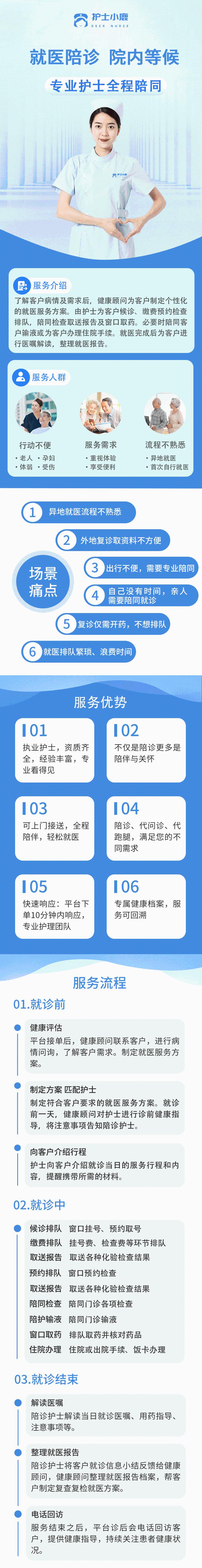 【新年服务费】2026年2月16日至2月23日(除夕-初七)服务正常开展,每单额外收取200元节日服务费。2026年2月24日(正月初八)起服务恢复正常,按日常标准执行。请您提前做好安排,如需预约服务,请提前联系客服或通过平台下单。 服务流程: 1.约定就诊行程: 护士接单后,主动与客户联系,沟通客户就诊需求,约定就诊行程。护士按照约定的时间,提前到达约定医院等候客户。 2.挂号候诊: 协助客户窗口挂号、预约取号。 3.排队服务:协助客户窗口挂号、预约取号,代客户候诊排队、候诊提醒,挂号费、检查费等环节排队费用代缴,窗口预约检查,取送报告及化验结果等。 4.陪同服务:门诊各项检查陪同、门诊输液陪同。 5.窗口取药:排队取药。 6.住院办理:住院手续、出院手续、饭卡办理。 7.解读医嘱:解读医嘱内容,用药说明及注意事项。 8.档案规整:协助客户整理就医档案,做好规整收纳。 9.诊后回访:陪同客户就医服务完成后,电话回访了解客户对服务体验的评级并给予特点健康指导。 预约流程: 1、本服务需至少提前24小时预约,请您在预约该项服务时,正确填写就诊人真实、完整的身份信息,上传挂号证明。 2、预约成功后请保持电话畅通,方便护士或客服与您取得联系,提前准备好就诊卡及相关证件、资料以及是否需要空腹、憋尿等做的检查。 3、不满16周岁的儿童、超过70岁的老人和行动不便/不具备完全民事行为能力的客户需家属陪同。 费用须知: 1、护士未接单,不扣费。 2、护士已接单未出门,取消订单时间大于约定时间2小时,不扣费。 3、护士已接单未出门,取消订单时间小于约定时间2小时,扣除订单金额30%。 4、护士已出门未抵达服务地点,扣除订单金额50%。 5、护士已抵达服务地点,因客户身体状况发生改变,无法继续提供服务,扣除订单金额50%。 6、护士已抵达服务地点,因客户原因取消服务,未提供服务,扣除订单金额70%。 7、护士已经开始服务,因客户原因取消订单,扣除订单金额100%(含耗材费)。 注意事项: 1、就诊过程中护士不进行任何医疗行为产生的费用垫付,请自行准备好现金、医保卡等。 2、本服务不包含代挂号,客户自行预约挂号或在本服务开始后由护士协助您挂号。 3、延时收费:超出服务时间后,每延时10分钟加收20元。
