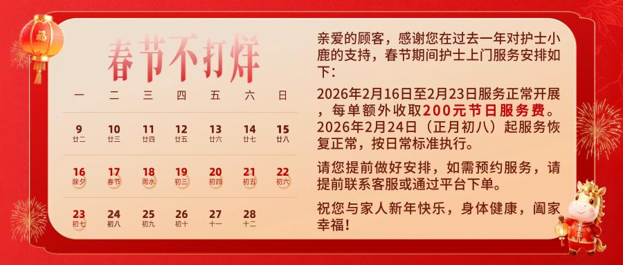 订购须知1.商家将在您下单后30分钟内确认接单。 2.订单确认后,修改订单或退款需提前3小时通知。 3.预约成功后由于您个人原因退单,将收取30%服务费。 4.护士出发后由于您个人原因退单,将收取70%服务费。 5.如商家接单后爽约将全额退款并向您赔付30元。 6.为保障您的权益,所有费用请通过到位平台支付。 7.延时费:每次服务时长不超过30分钟,如超出服务时长,每超时20分钟将加收20%(40元)延时服务费。 8.耗材费:上门可携带服务所需耗材,耗材费用需用户支付。 9.不在服务范围内:受限于客观条件,具有攻击性、易产生过激反应的患者,不在服务范围以内。 10.本服务由专业医疗机构「护士小鹿」提供,专家团队全程支持。
