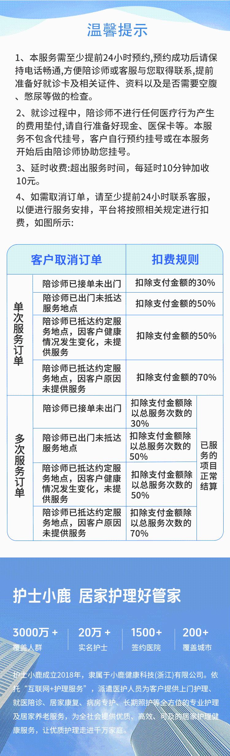 订购须知1.商家将在您下单后30分钟内确认接单。 2.订单确认后,修改订单或退款需提前3小时通知。 3.预约成功后由于您个人原因退单,将收取30%服务费。 4.护士出发后由于您个人原因退单,将收取70%服务费。 5.如商家接单后爽约将全额退款并向您赔付30元。 6.为保障您的权益,所有费用请通过到位平台支付。 7.延时费:每次服务时长不超过30分钟,如超出服务时长,每超时20分钟将加收20%(40元)延时服务费。 8.耗材费:上门可携带服务所需耗材,耗材费用需用户支付。 9.不在服务范围内:受限于客观条件,具有攻击性、易产生过激反应的患者,不在服务范围以内。 10.本服务由专业医疗机构「护士小鹿」提供,专家团队全程支持。